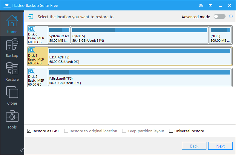 As professional Windows backup and cloning software, Hasleo Backup Suite enables you to not only restore an MBR system backup image to a GPT disk, but also restore a GPT system backup image to MBR disk.