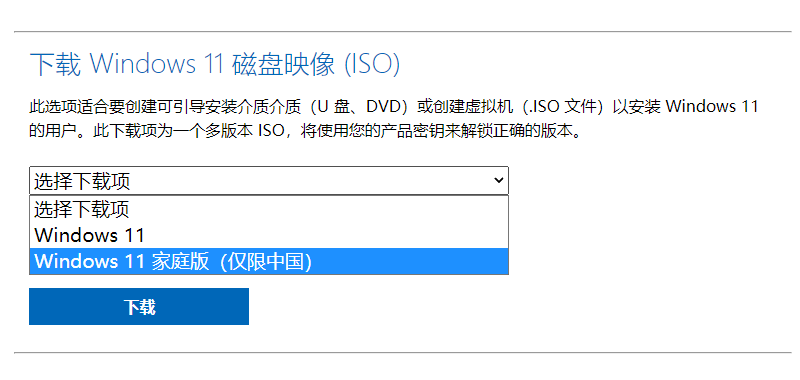 步骤 2. 找到“下载 Windows 11 磁盘映像 (ISO)”,点击“选择下载项” 下拉框并选择要下载的 Windows 11 版本。